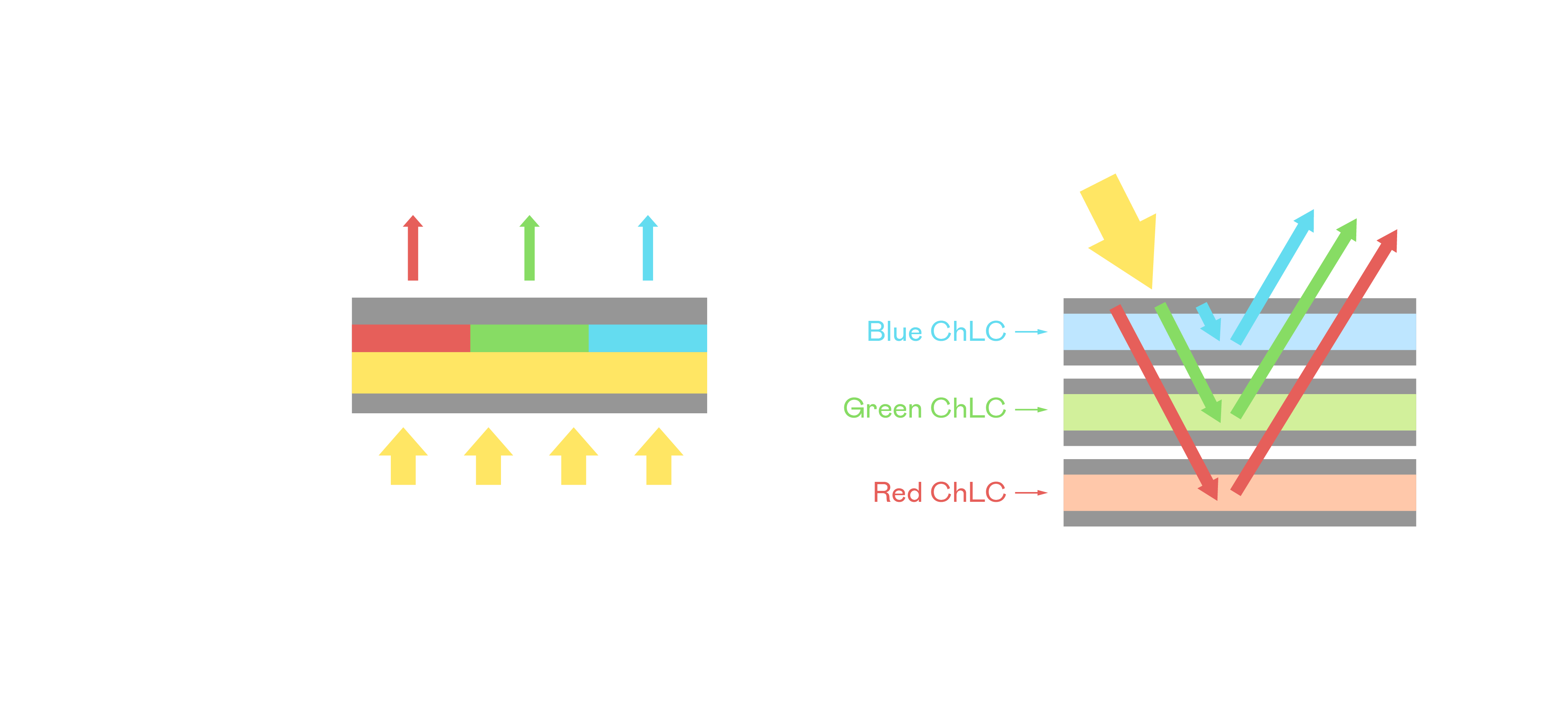 Ag尊龙凯时胆固醇液晶显示器是由红、绿、蓝三层胆固醇液晶面板堆叠而成,并采用无彩色滤光片设计,减少环境光在反射过程中的损耗。
